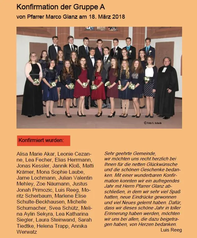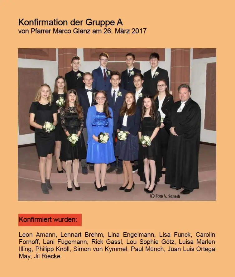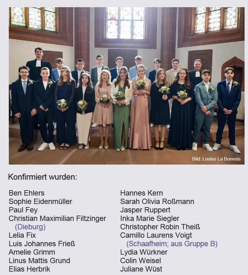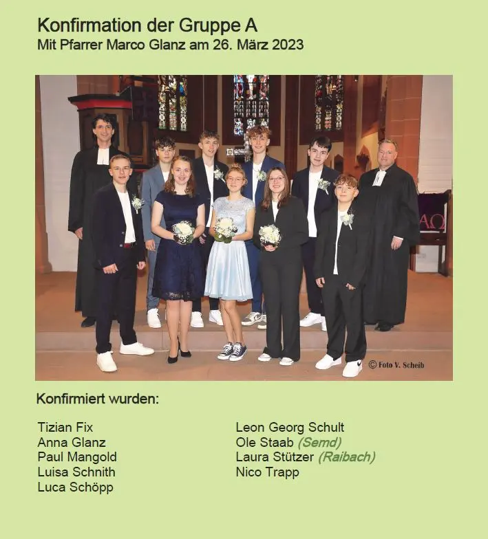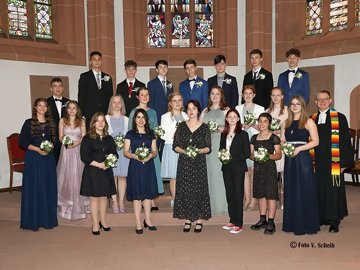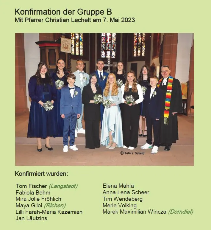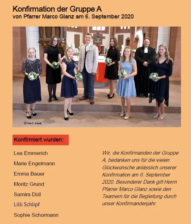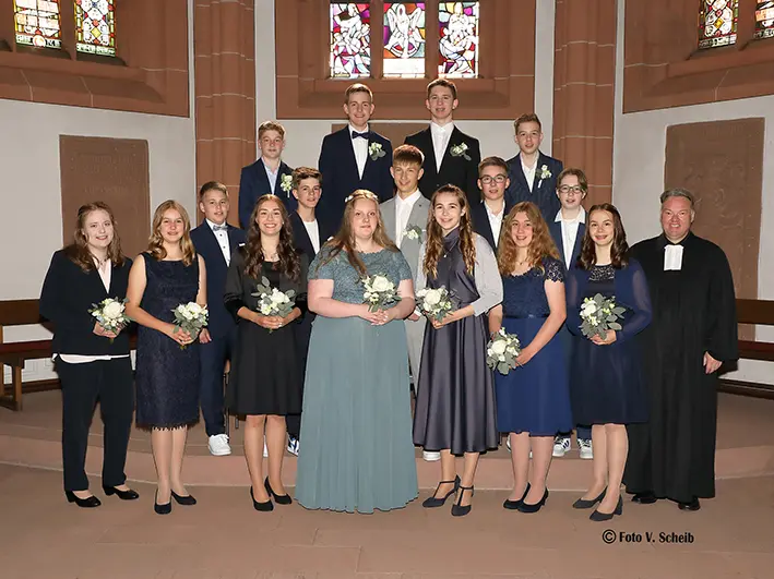 Vorne v. l.: Emily Preiss, Rosalinde Richter, Lara Melina Aesche, Minu Willner, Luiselotte Richter, Charlotte Schad, Herr Pfarrer Lechelt.