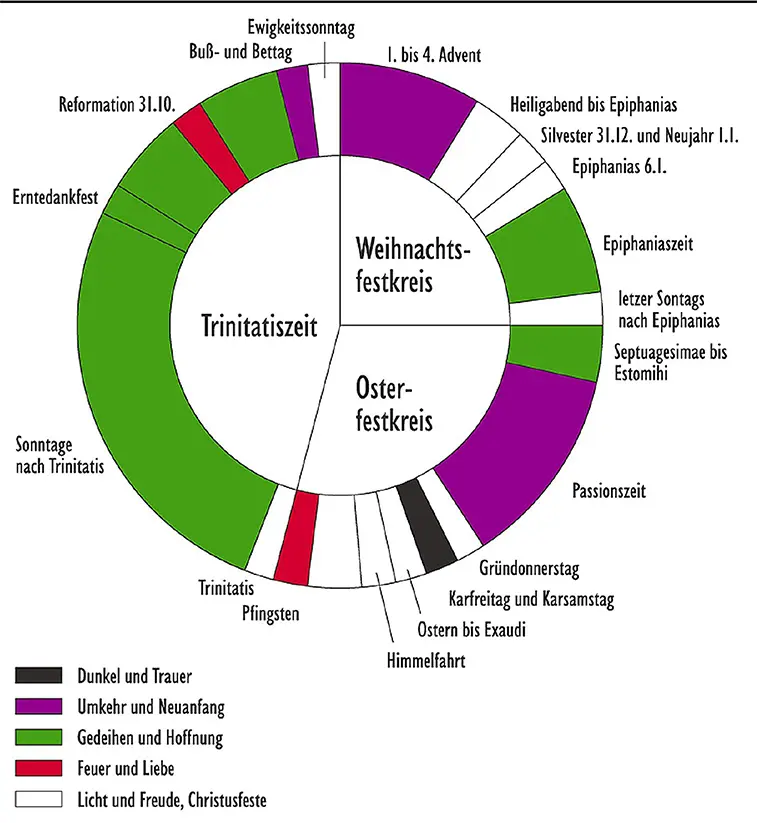 Es umfasst auch Themen des menschlichen Lebens, wie Geburt (Weihnachten), Ernte und Tod (Karfreitag).